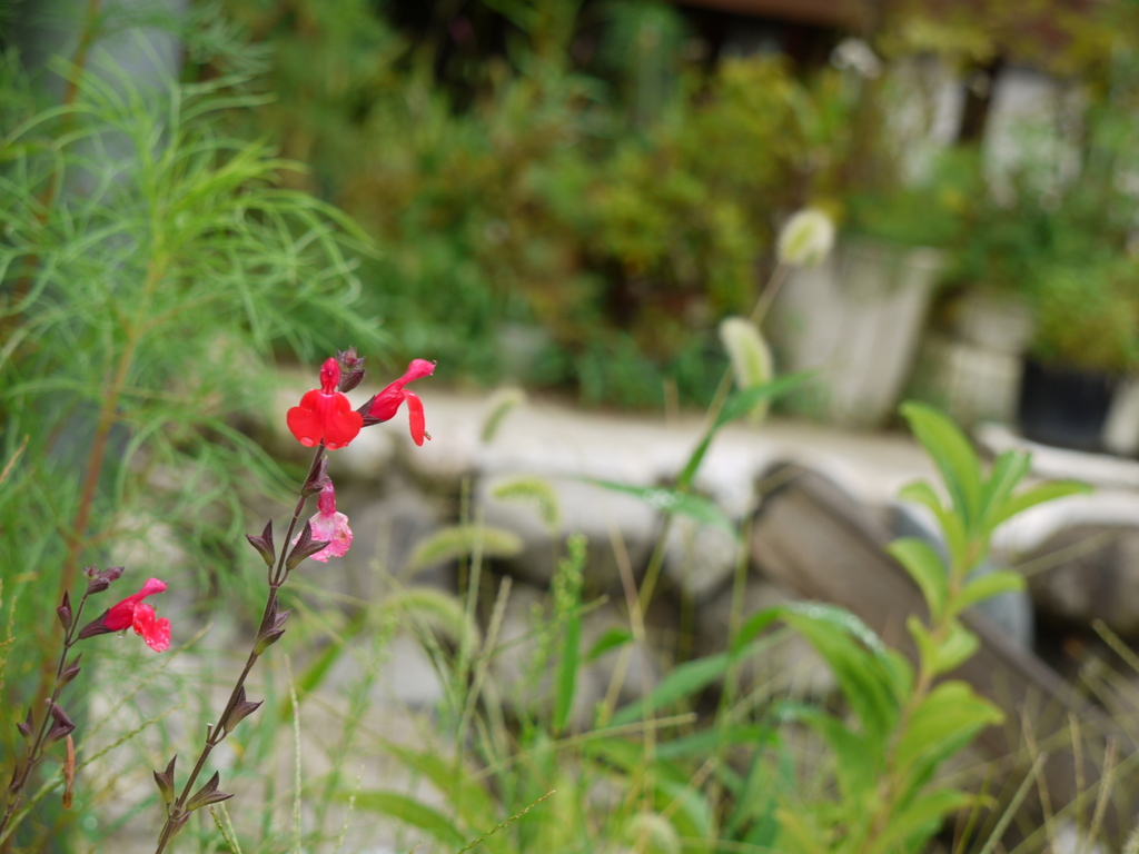 赤いチェリーセージの向こうにエノコログサ、秋ですね。