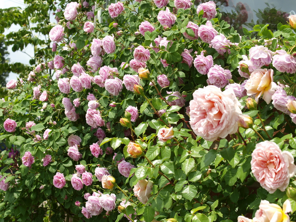アブラハムダービーとブルボンクイーンの共演です。この組み合わせが大好きで、庭で一番日当たりがよく目につく場所に置いてます^^