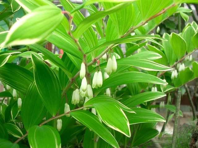 実家の庭の、斑入りアマドコロ・・・だと思うんですが、ちょっと自信がないです。(先に投稿した実に対して、花の写真です。2010年5月 撮影)
