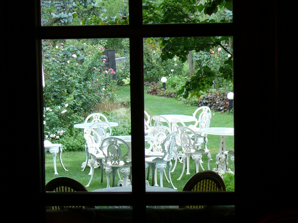 ケ-キを食べながら見える窓の景色、前半に見たプライベ-トガ-デン側に居るのが不思議です。