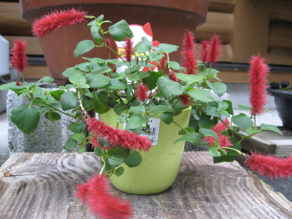 この鉢の向こうに見えるのは猫ちゃんの形の名札ですね。