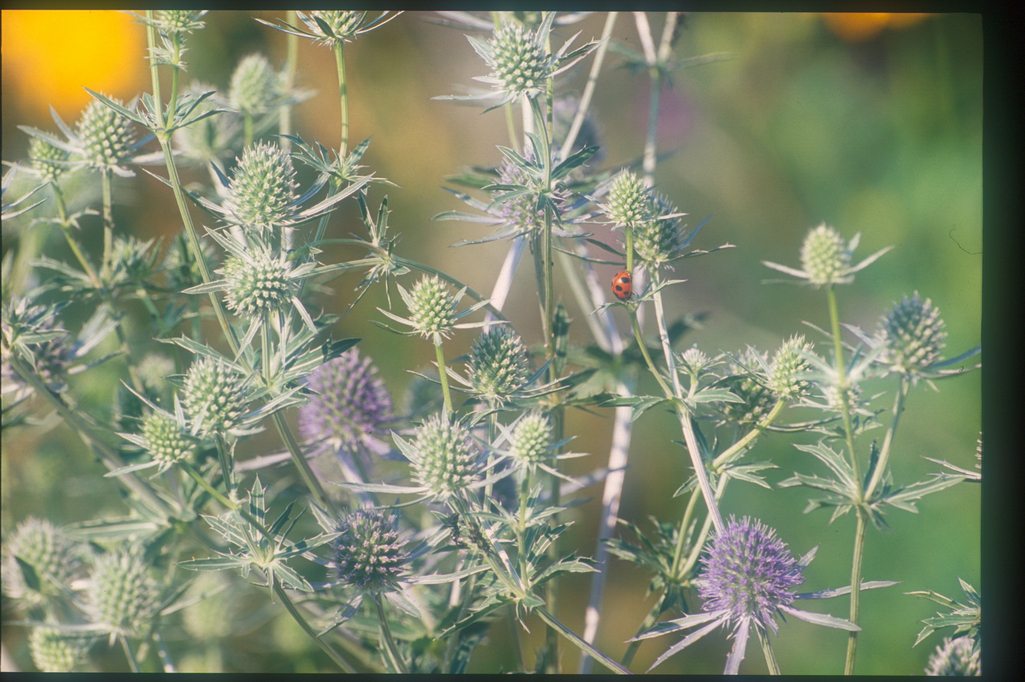 テントウムシが一匹くっついて、可愛いですネ♡ 瑠璃玉あざみ、大好きです。