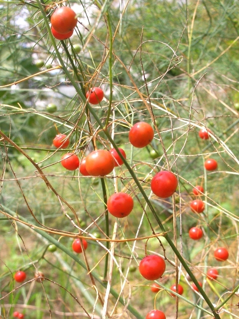 アスパラってこんなに大きくて赤い実をつけるのですね!私も初めてみました。