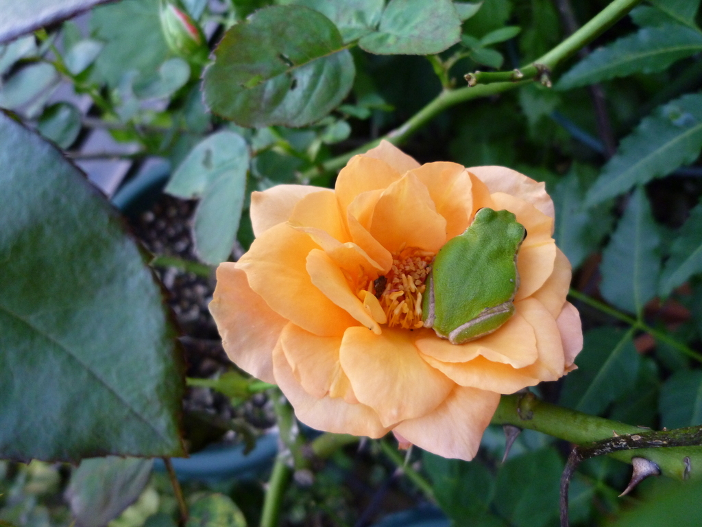 バラのお花の中で香りに浸ってとってもリラックスしてるのでしょうね。可愛い蛙さん。