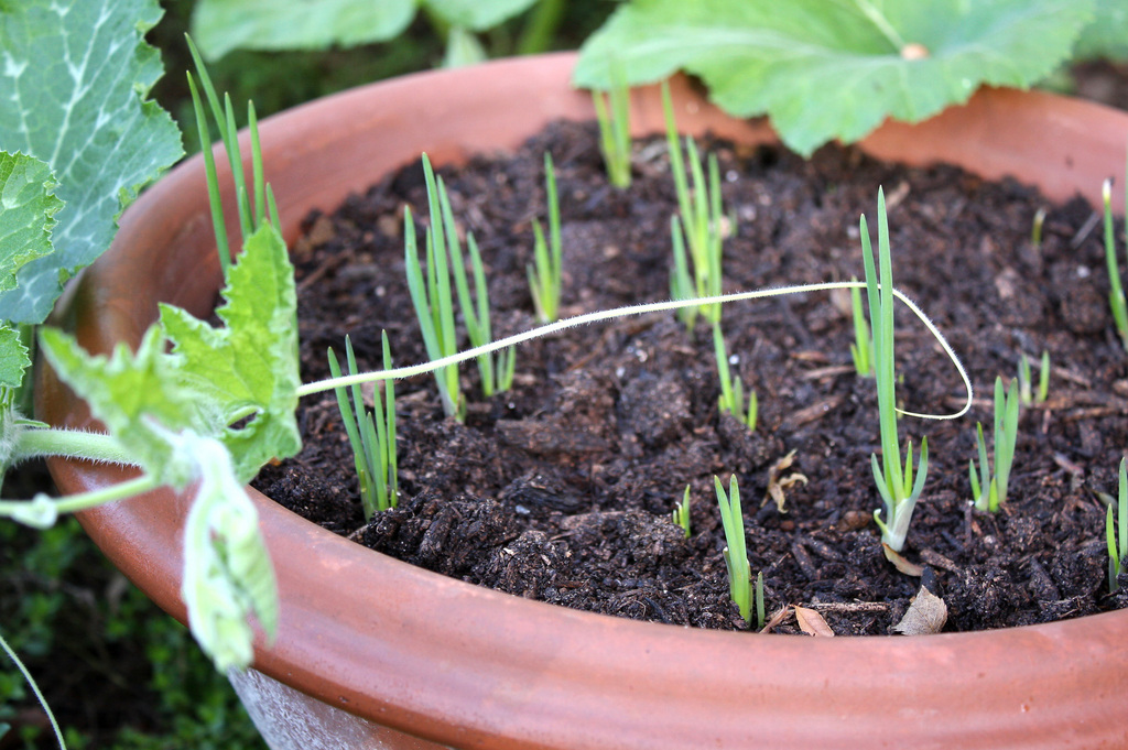 我が物顔に伸びるカボチャ。芽をだしたばかりのひ弱なワケギにツルを伸ばしています。