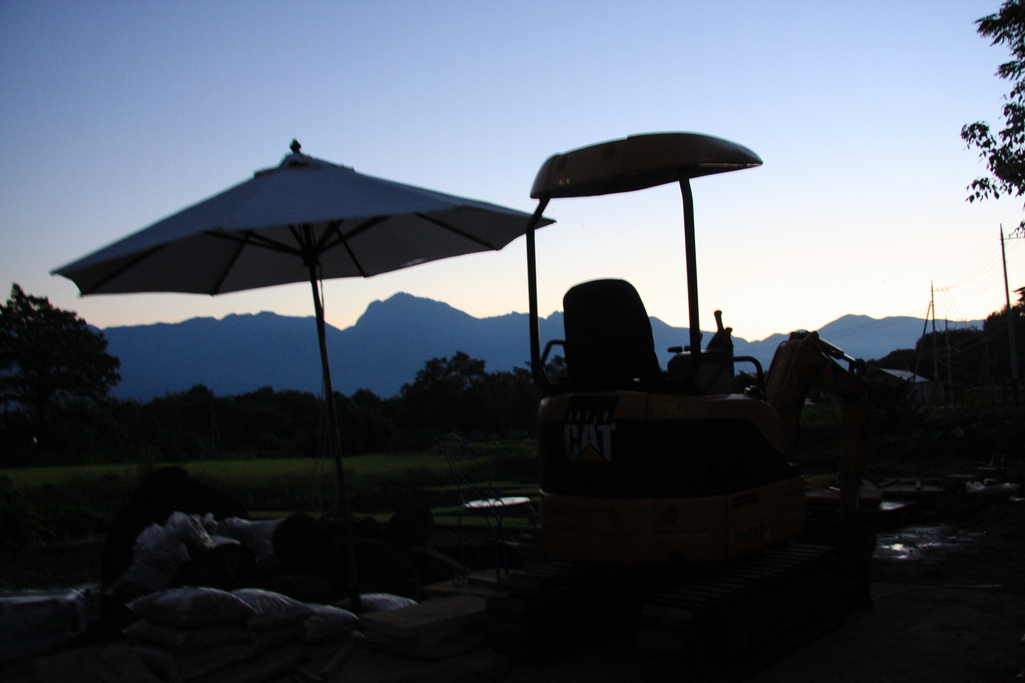 今頃汗流しているころですね、素敵な庭が出来ていく様子がタイムリ-に見れてとても嬉しいです。作業終了タイトル、重機と山の稜線の対比、なぜかホットする1枚です。
