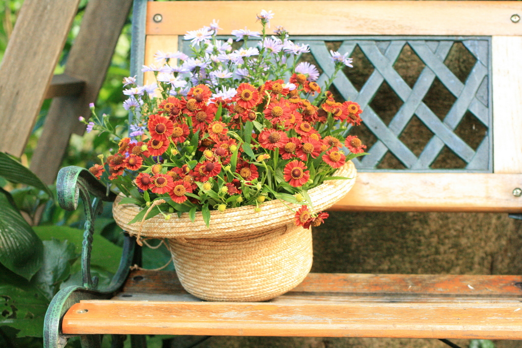 麦わら帽子にいっぱいつまったお花、可愛いですね~^^ とっても素敵なアレンジ♡ この色合い、以前のビズ秋号でグラス類と組み合わせてあるのを見た気がしますよ!さすがどどさん、素敵な組み合わせをよくご存じですね^^