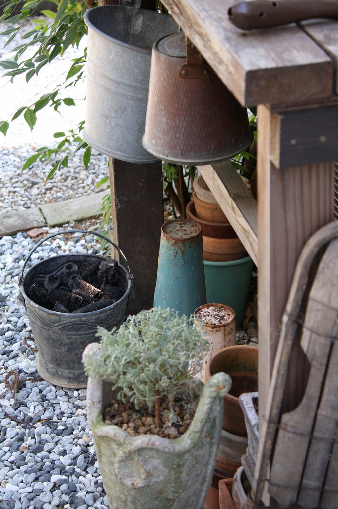 エアコンの室外機をカバーするためのジャンクな作業台周辺。室外機が見えた方がさっぱりするんじゃないのという声が聞こえてきそう。