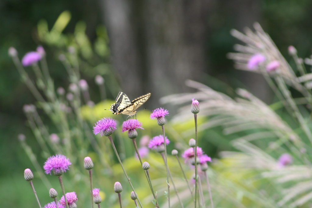 アザミのピンクが濃いですね~。優しい雰囲気のお写真にこのアザミとアゲハ蝶がアクセントで素敵ですね!もうススキが出てきてるんですね!