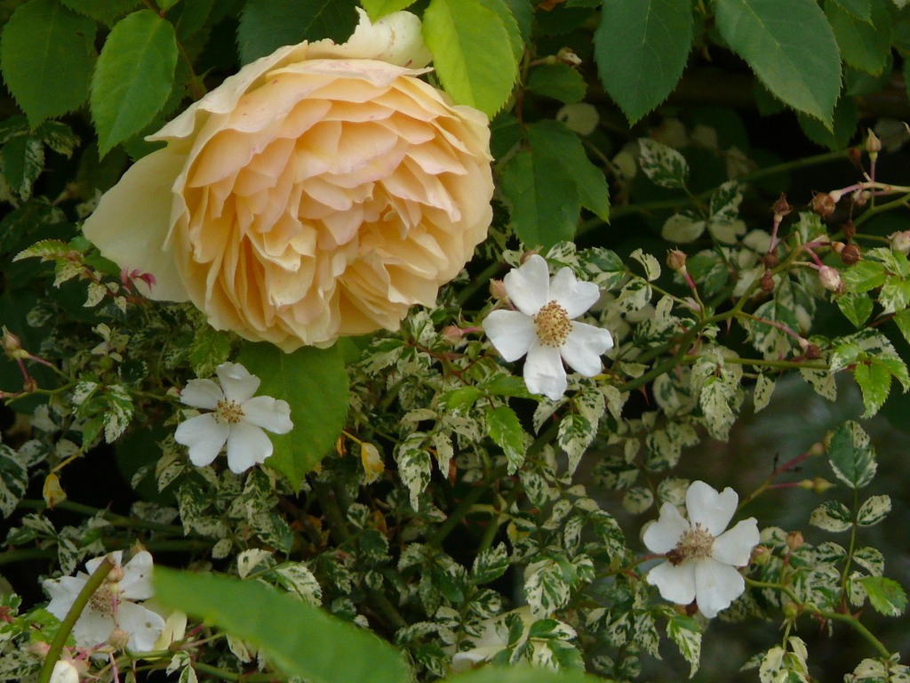 斑入りのノバラ、珍しいですね。うつむきかげんのグラハムといっしょで、ふんわりと優しい感じがして、好きです。