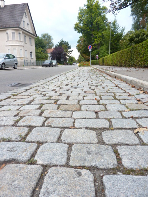 道路の横にわっ、車を止めることのできるゾーンがありますが、その部分を区別するにも石畳が使われてるんですよぉ~っ!少し大振りの角のとられた石・・・、全部大きさがことなるモノを不整列の美学で並べるっ・・・すばらしい~っ!家のカーポートもこうしてみたいっ♪♪