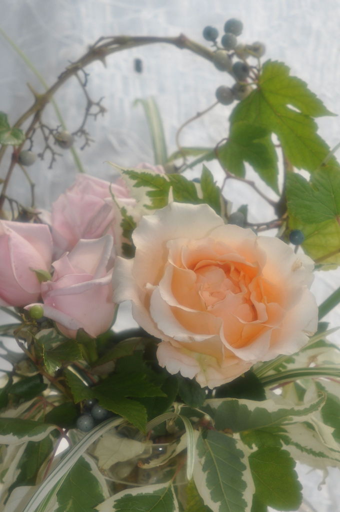 オレンジシャーベットのアレンジですね^^! ヤブランや黒い実がいいアクセントになっていますネ(*^^*)