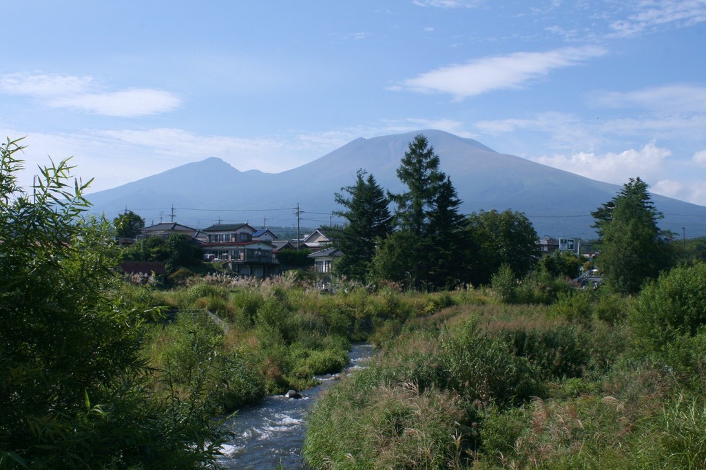 これは8日に撮ったものです。急に暑くなって若干霞がかかっています。一枚目は軽井沢を流れる湯川越しの浅間山。