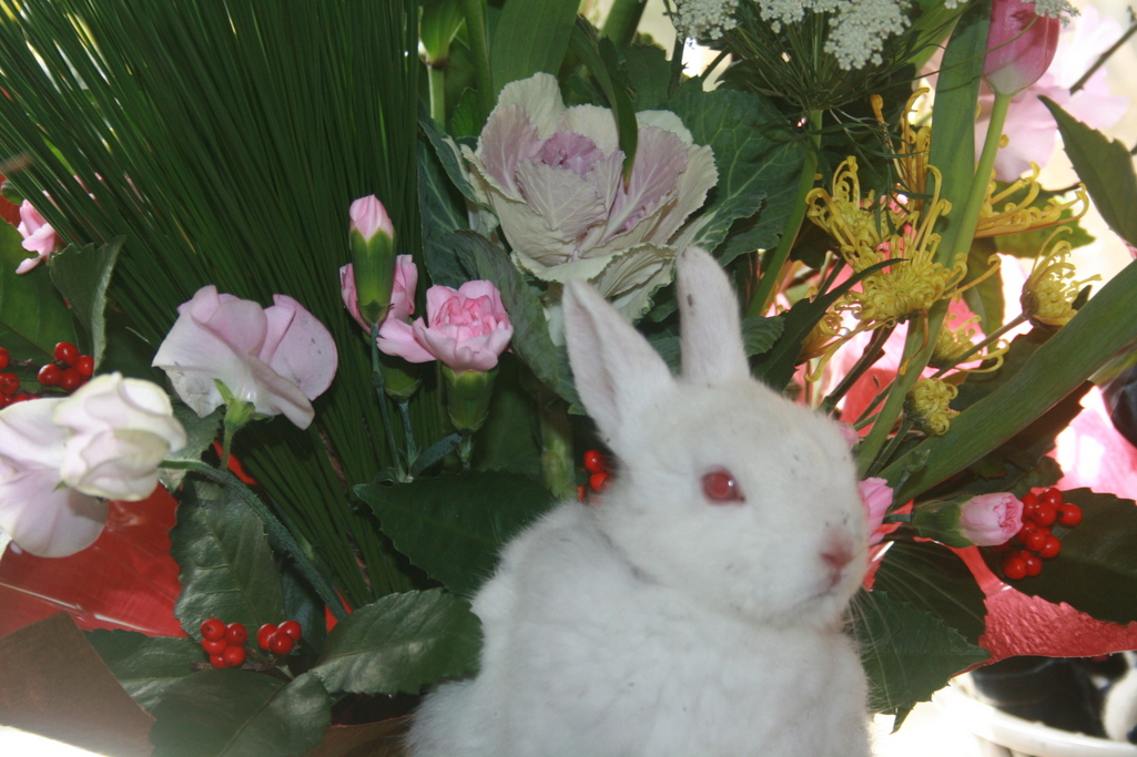 お花に。埋もれそうなかわいい子ウサギちゃんですね。