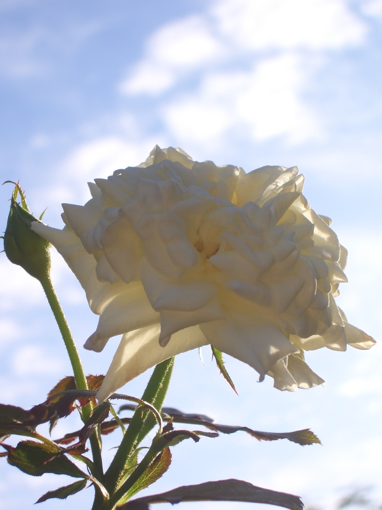 青い空、白い雲に白い薔薇、絵になります^^ 少し残った葉っぱの赤もとってもキレイ(*^^*)