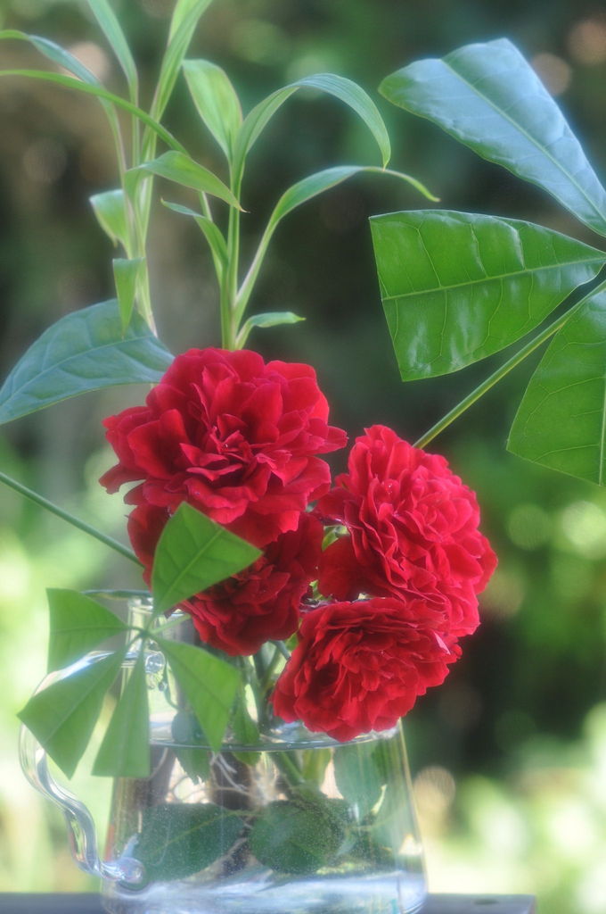 パキラのグリーンがバラの赤を引き立てていますね。