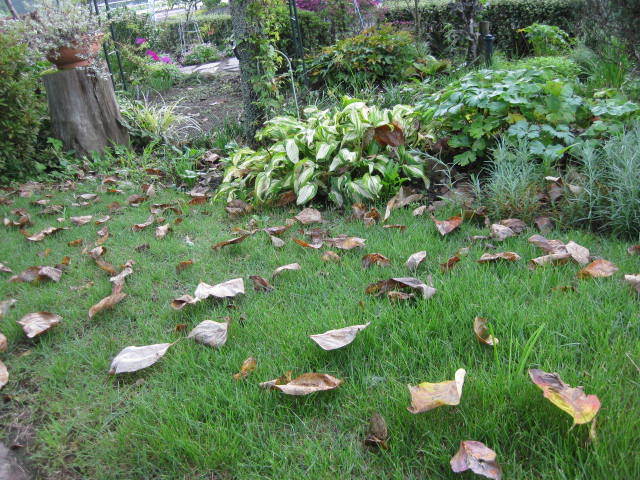 アー、うっとおしい落ち葉の季節到来。うちは昨日庭の片隅に落ち葉コンポストを作りました。