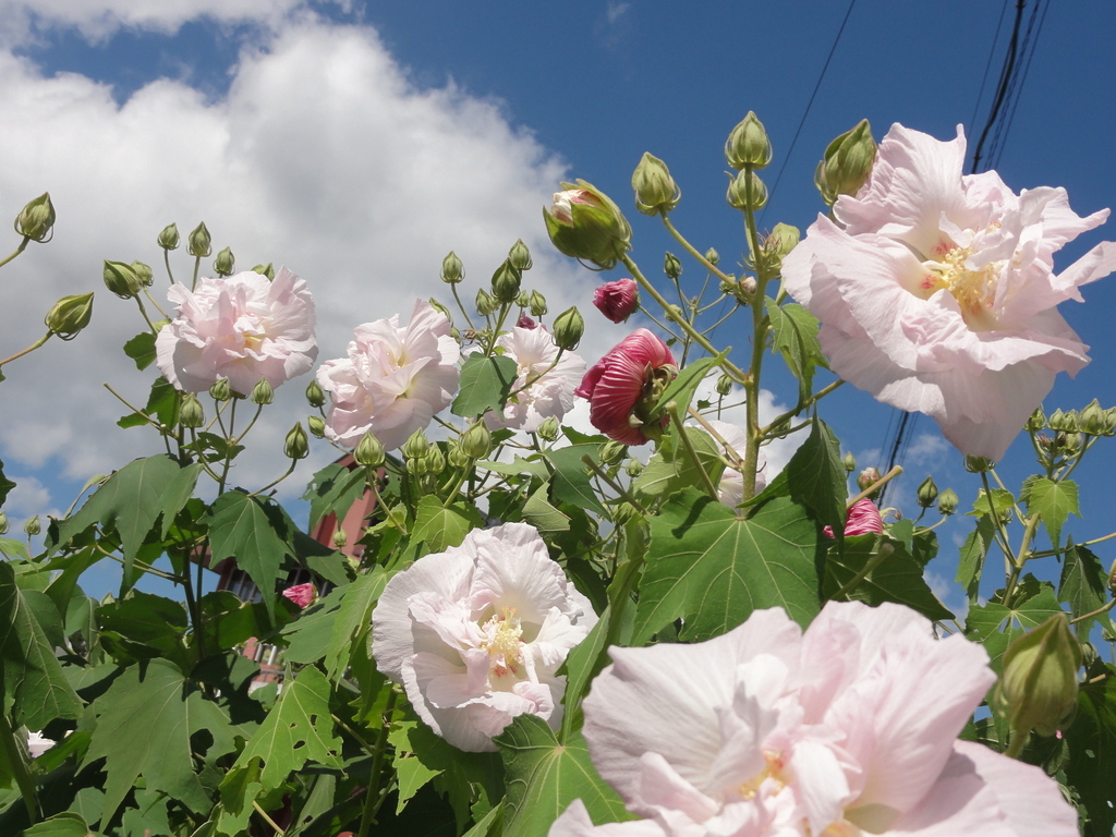 芙蓉は伸び伸びと大らかな花ですよね。空をバックにすると更に…