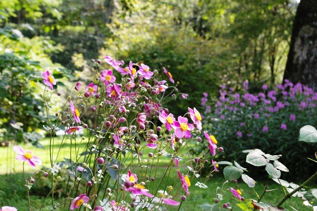 シュウメイギクが綺麗に咲いていますね。バックのグリーンや紫もまた綺麗ですね。