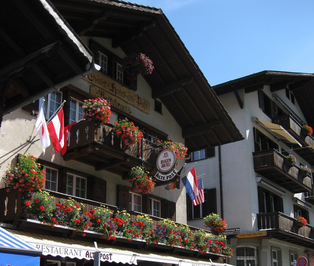 これ、これ!これぞスイスの街。窓辺のゼラニュームなどの鉢植えが建物に完全に溶け込んでいますね。