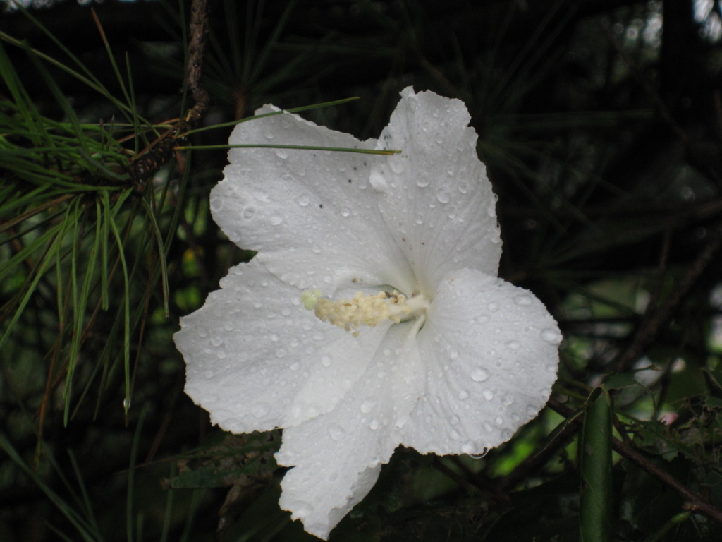 ムクゲは学名がハイビスカスっていうんですね。そういわれてみればお花はハイビスカスそのものですね。雨で濡れた真っ白のムクゲ、素適です。