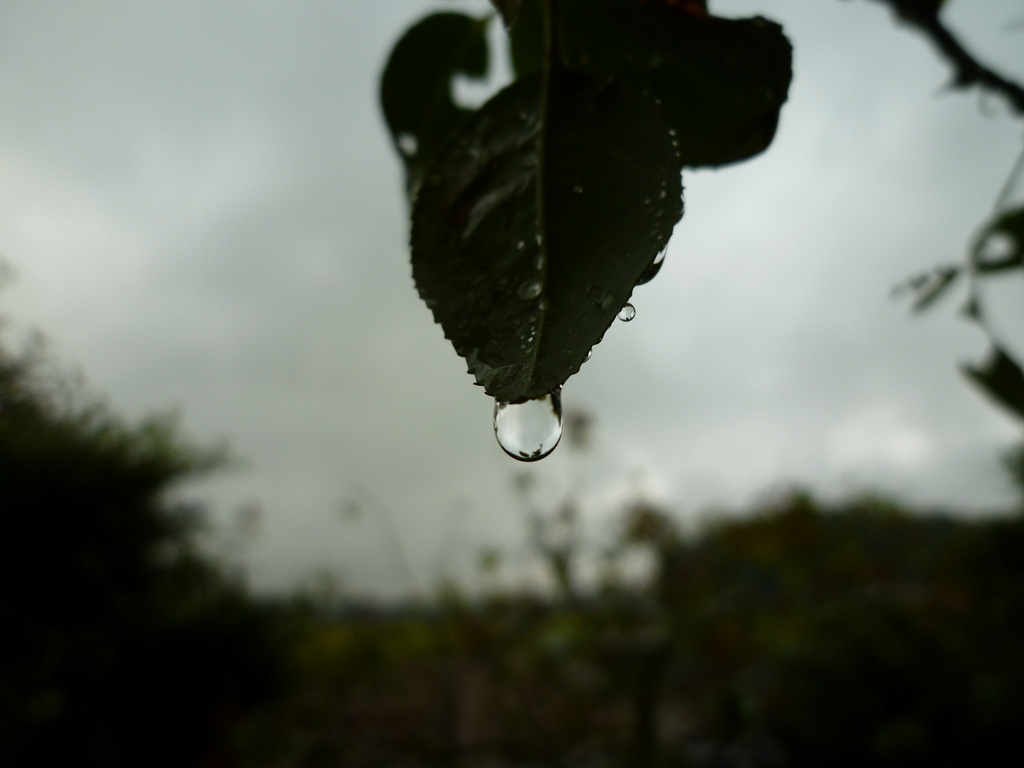 空の色とそれをバックにした葉っぱの先の今にも落ちそうな雫、雨を予感させますねー。こちらも今日、明日はずっと雨のようです。