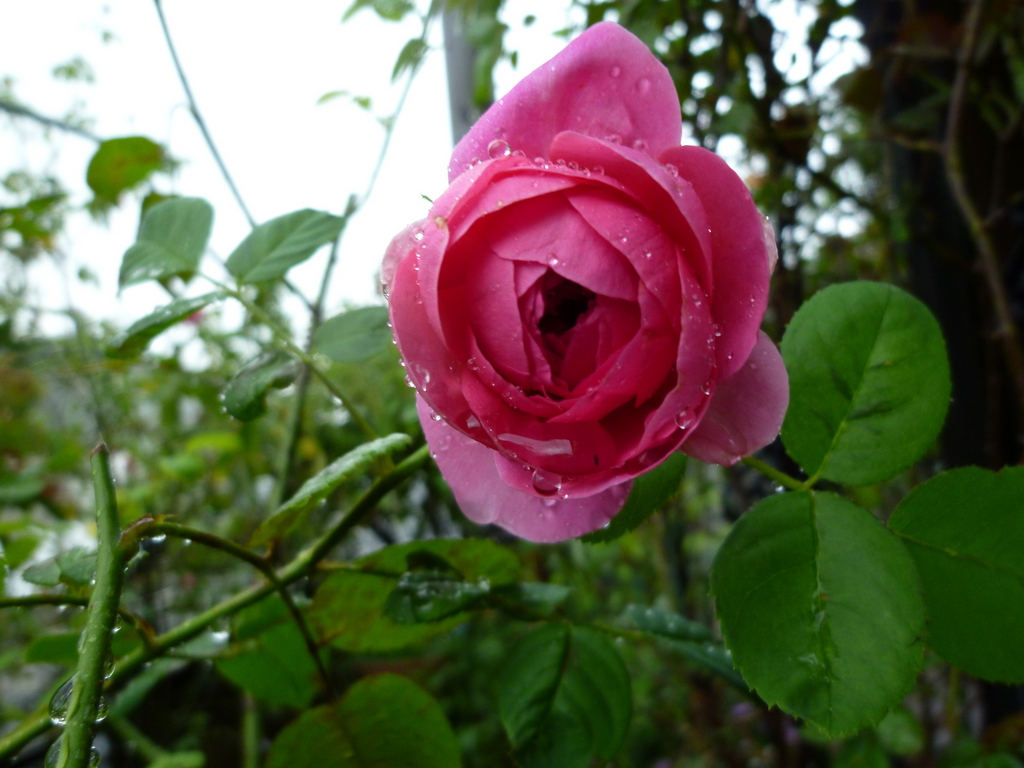 コロンとした開きかけの薔薇、可愛いですね。雨で傷んでは可愛そう!