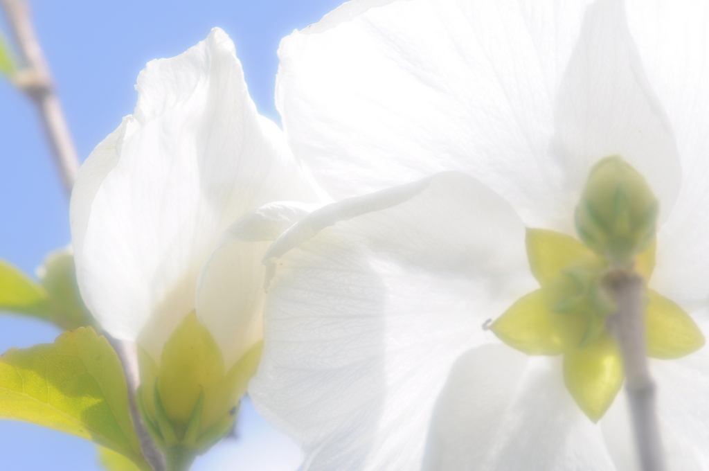青空に透き通るような白い花弁。星を形どった額が可愛らしくアクセントになっていますね。(^_^;)気持ち良さそう。