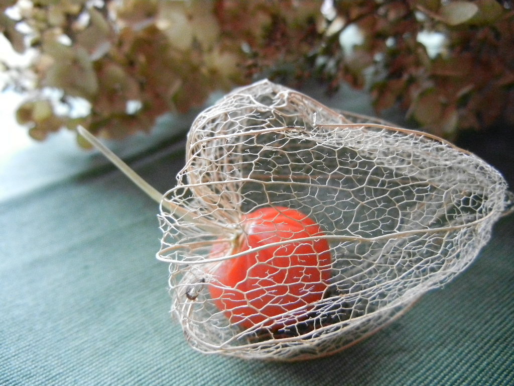 私もこんなホオズキを見たらこんな風に撮るかもしれないと思いました。オフホワイトとオレンジとクロス(でしょうか)のブルーグリーンが印象に残ります。