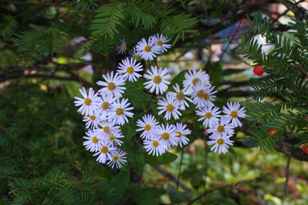 散歩道のイチイの生垣の間からカントウヨメナ(?)が顔を覗かせていました。イチイの実や赤いミズヒキの花も見えます。