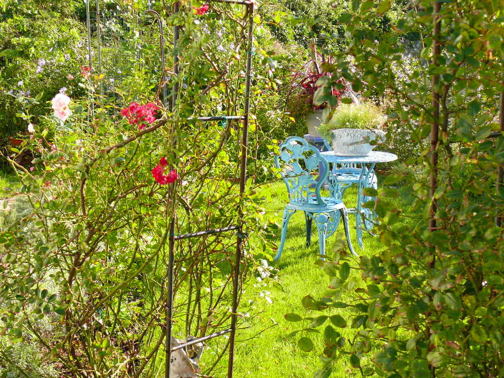 バラやいろんな木立に囲まれた素適な空間ですね。ここでお茶すれば最高。