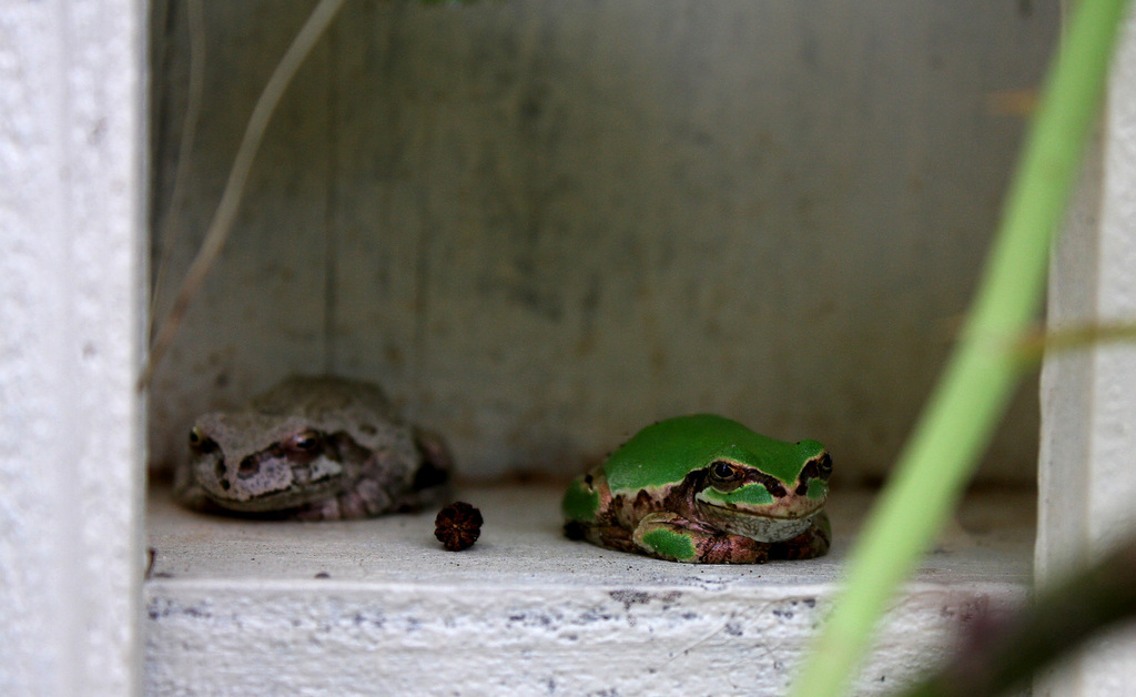 おじいさんガエルとおばあさんガエルが縁側でのんびりとしているような風景ですね。