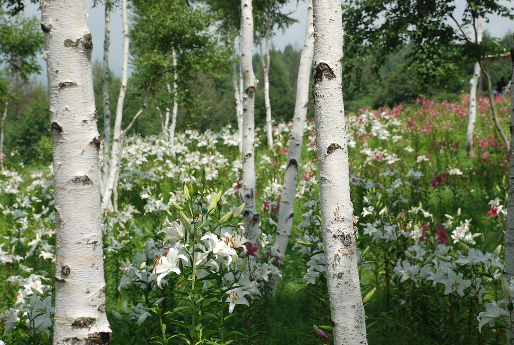 スキー場のゲレンデを夏の間ユリ園にしているところが時々ありますが、ここもそういうところですか。白いユリと白樺の白い肌が妙にマッチしていますね。