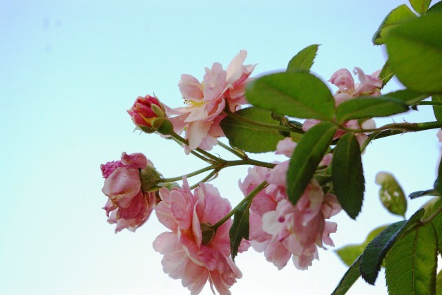 枝垂れたピンクの薔薇と青空、いいですね~(*^^*) ステキです。