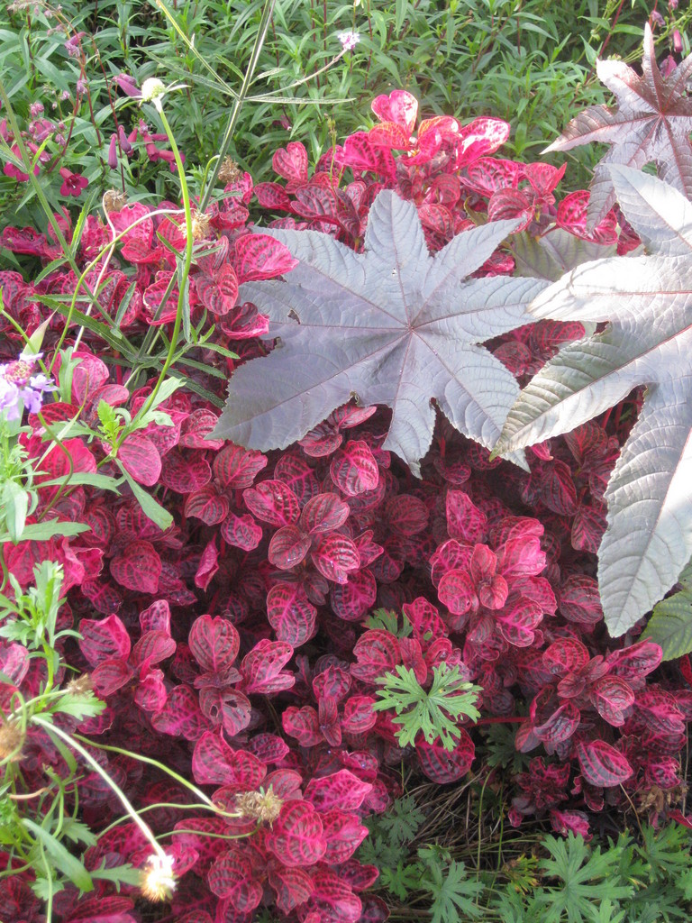 赤い小さな葉に大きな銅葉のヤツデのような葉がかぶさってとってもきれいですね。