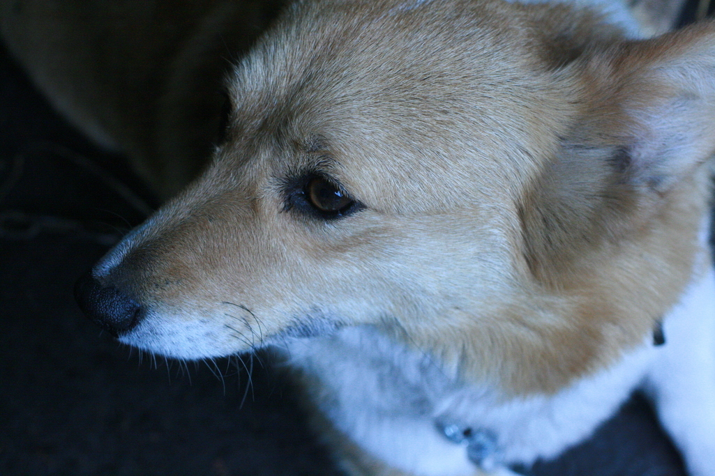 于~ん、いい子だ。やさしい目ですね。コーギー犬は大好きです。今は亡きしげるを思い出します。よく似てます。賢くて忠実な相棒でした。(^_^;)写真があったらアップします。