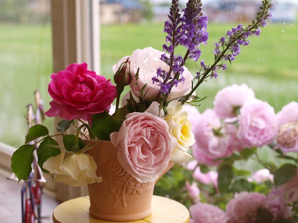 今、摘んだばっかりのバラたちを少しずつ生けると、誰でもプロみたいなアレンジになっちゃいますね