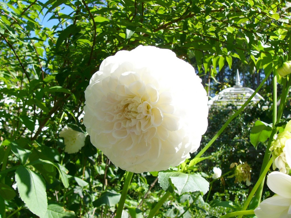 ホワイトガーデンの純白のポンポンダリア。強い日差しの中でハレーションを起こしています。