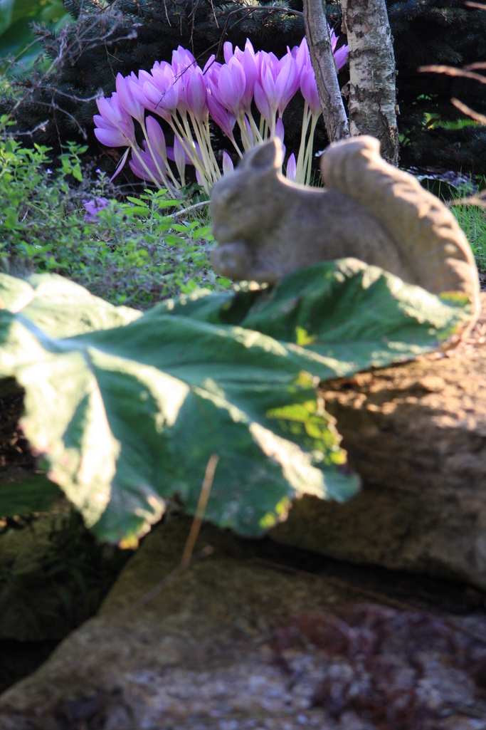 手前のグンネラとリスさんの向こうの日陰に固まって咲いているコルチカムがとってもきれいです。