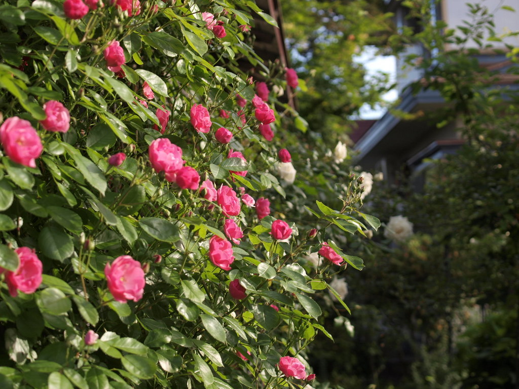壁に誘引しているので、横から見ると壁紙みたいにビシー!っとなってます。この迫力、すごい!普段は可憐でかわいい小花なのに・・・(笑)