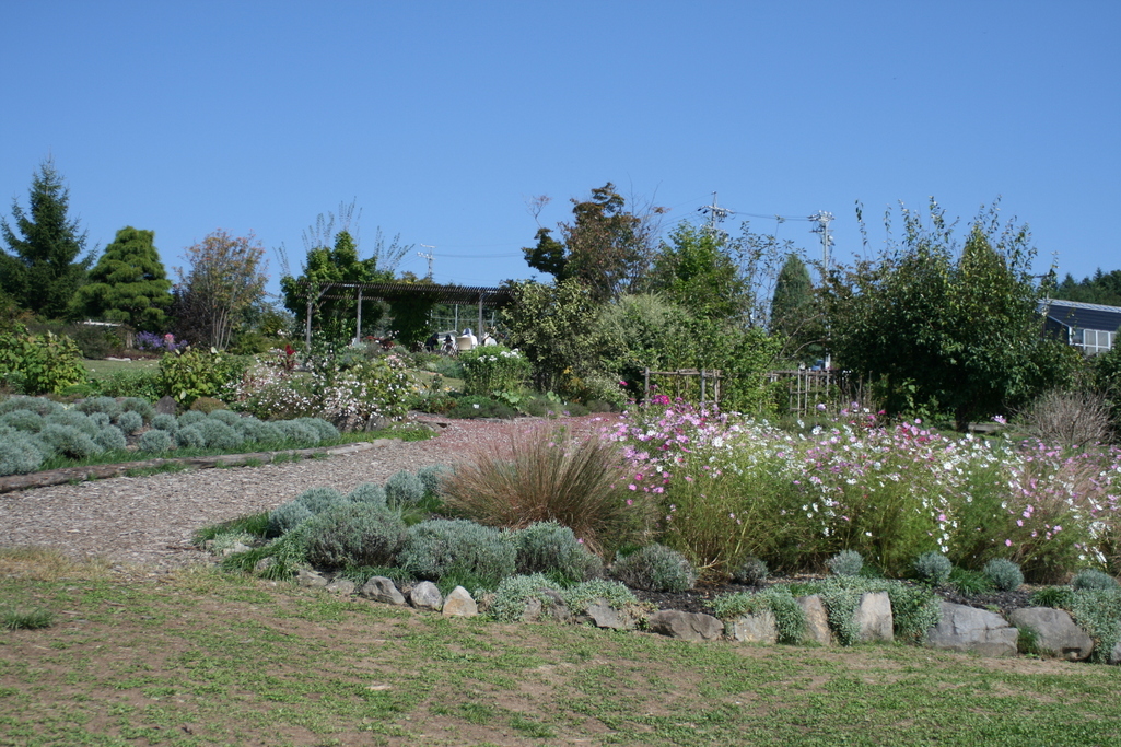 ガーデンの南側から見たところ。右端に見える建物が2階のレストラン。