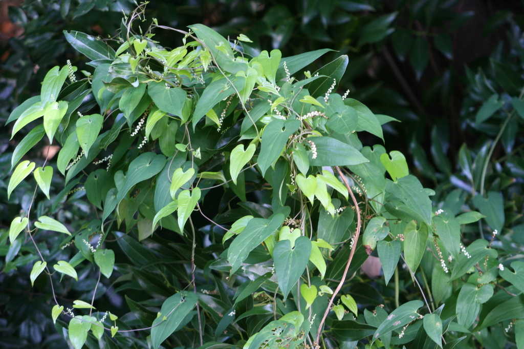 ヤマノイモの雄花 フェンス越しのお宮の大きな木にからまっています。ムカゴもそろそろ・・ 下には自然薯が・・