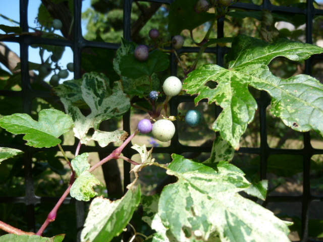 このあたりには野生のノブドウがあちらこちらにありますが、斑入りのノブドウははじめて見ました。園芸種なのでしょうか。