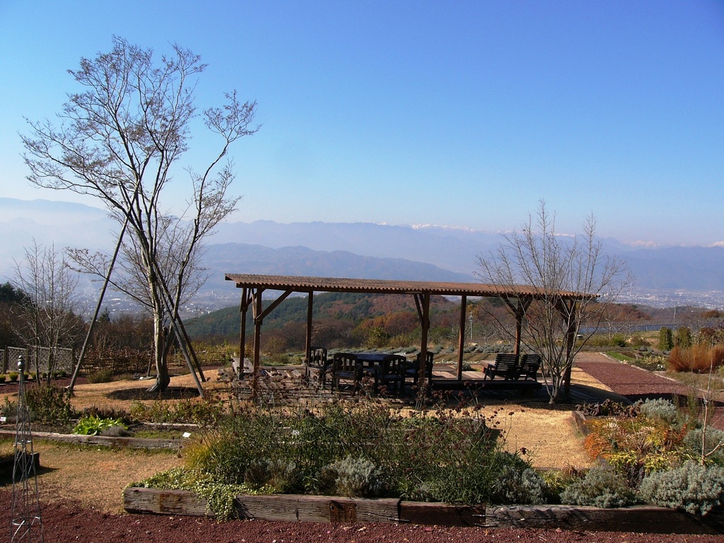 昨日はアルプスを遠望したかったのですが、もやっていて見えませんでした。そこでこれは以前11月に撮った写真をアップします。遠くの稜線の先に雪をかぶったアルプスが見えます。これはガーデンの正面の景色です。