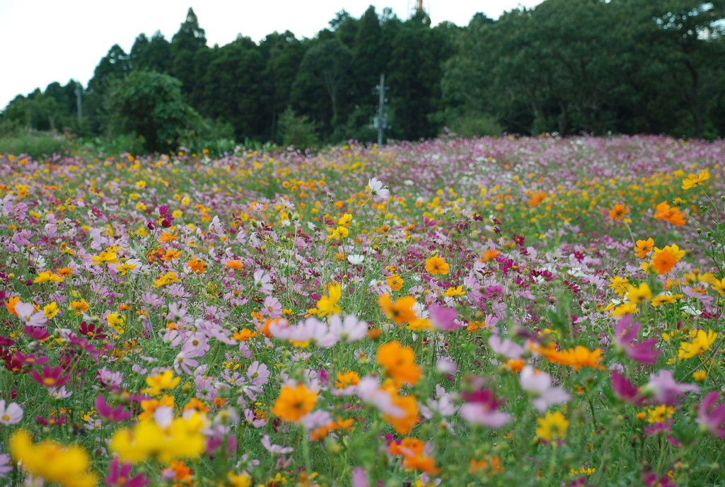 色とりどりのコスモスが一面に咲き乱れているコスモス畑って始めて見ました。