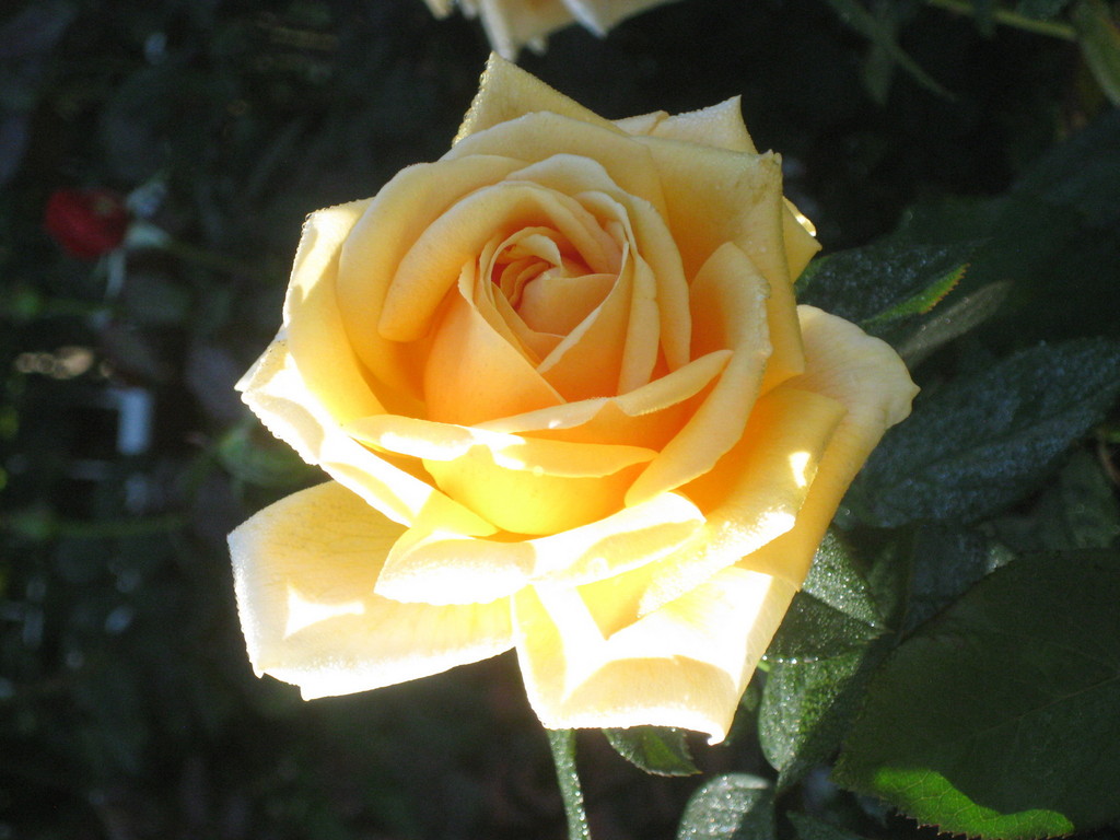 雨上がりの日の光を浴びたバラは神々しさを感じさせます。