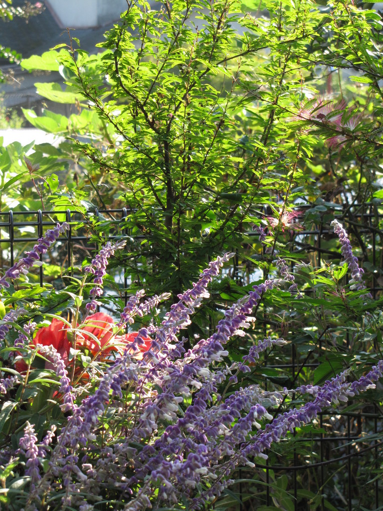 セージの紫が、秋を告げていますね。奥にはねむの花も見えて、楽しめるお写真ですね^^