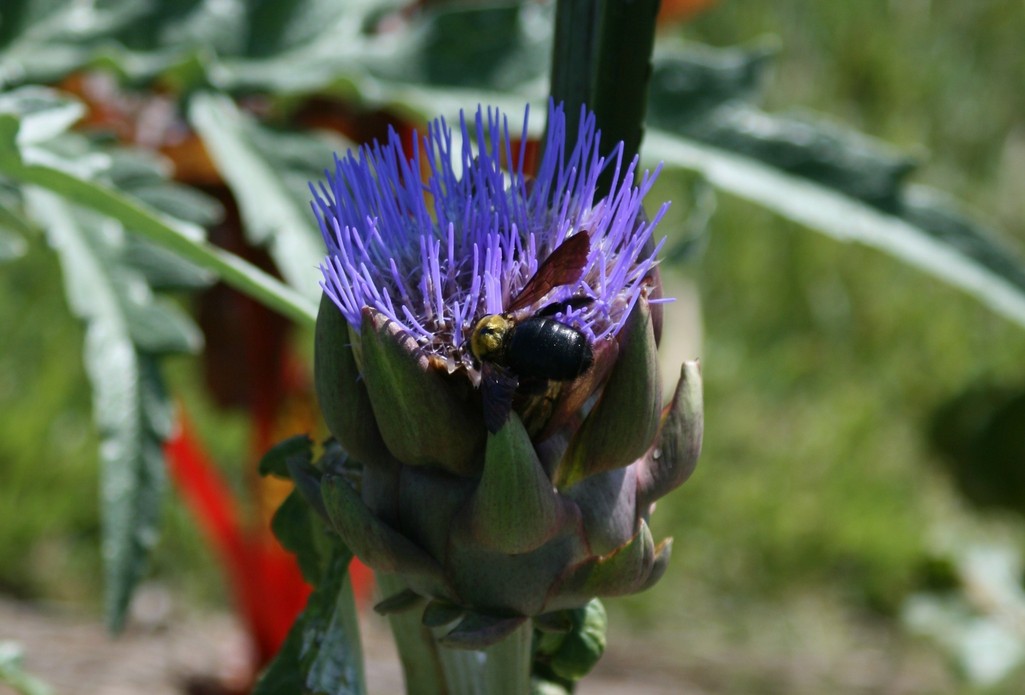 アーティチョークの花が咲いてクマバチが蜜を吸っていました。