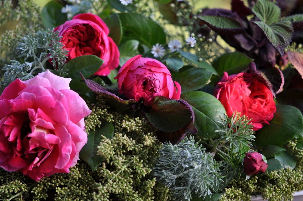 アレンジ?でしょうか?コリウスの深いレッドパープルとバラの色がマッチしてますね。
