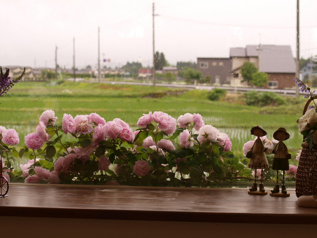 お店のテーブル席から見た出窓風景です。ちょっと雨が落ち着いた午後。